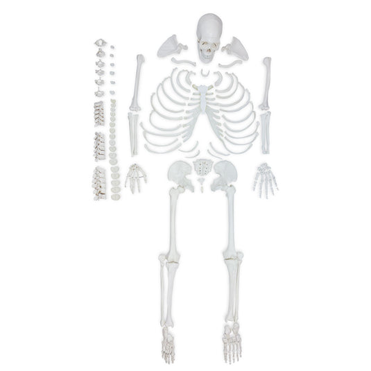 Mô hình bộ xương người có kích thước như thật, thể hiện đầy đủ bộ xương người với các xương rời: hộp sọ, xương trục, xương móng, xương sườn, xương ức với sụn sườn, chi trên và chi dưới, xương cùng và xương cụt được thể hiện chi tiết. Một bên (của bàn chân trái) được xâu bằng dây, bên còn lại được tháo rời. Hộp sọ có thể tháo rời thành 3 phần: vòm sọ, nền sọ và xương hàm dưới. Được làm từ vật liệu tổng hợp bền. Đi kèm với một mô hình giải phẫu 3D tương tác với thực tế tăng cường là một công cụ tuyệt vời để khuyến khích việc học tập và hỗ trợ. Nền tảng này cho phép sinh viên tham gia vào phân tích so sánh các mô hình giải phẫu khi họ so sánh và đối chiếu cấu trúc của từng cơ quan. Sáng kiến này cũng cung cấp một nền tảng để giáo dục thường xuyên, tạo cơ hội cho tất cả sinh viên tăng cường kiến thức về giải phẫu, sinh lý và bệnh lý học.