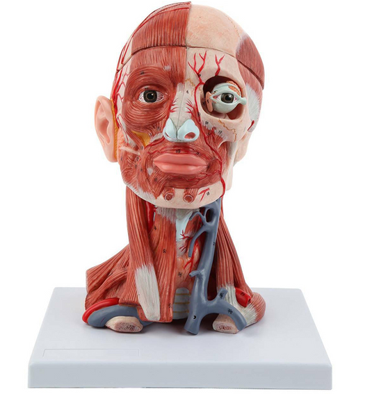 Mô hình giải phẫu này được làm bằng nhựa resin và thể hiện chi tiết giải phẫu cơ bắp nông và sâu của đầu và cổ, cũng như hiển thị các dây thần kinh, xương và các bộ phận mạch máu. Mô hình có thể được phân tích thành 10 bộ phận: - Đáy đầu; - Xương sọ; - Mắt; - Tấm lưỡi não; - Bên phải của não; - Bên trái của não (4 bộ phận); - Tĩnh mạch cổ. Có thể tháo rời từ đáy. Đi kèm với mô hình giải phẫu 3D tương tác với thực tế tăng cường, đây là một công cụ tuyệt vời để khuyến khích việc học tập và hỗ trợ. Nền tảng này cho phép sinh viên tham gia vào phân tích so sánh các mô hình giải phẫu khi họ so sánh và đối chiếu cấu trúc của các cơ quan riêng lẻ. Sáng kiến này cũng cung cấp nền tảng cho việc đào tạo liên tục, tạo cơ hội cho tất cả sinh viên nâng cao kiến thức về giải phẫu, sinh lý và bệnh lý sinh lý.