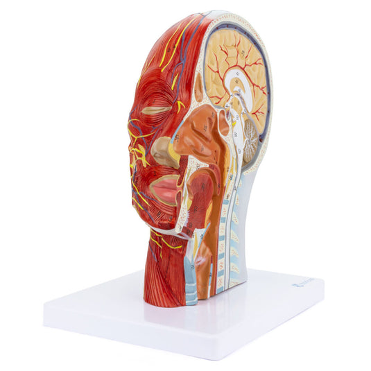Mô hình kích thước thật thể hiện nửa bên phải của đầu và cổ con người, được cắt theo một mặt phẳng dọc giữa. Việc mổ xẻ nông các cơ mặt làm lộ ra các mạch máu và nhánh dây thần kinh nông chính của mặt, da đầu và tuyến nước bọt dưới hàm. Việc mổ xẻ giữa làm lộ ra não với cấu trúc bên trong của nó, thực quản, đường hô hấp trên và một đoạn xương sống cổ.