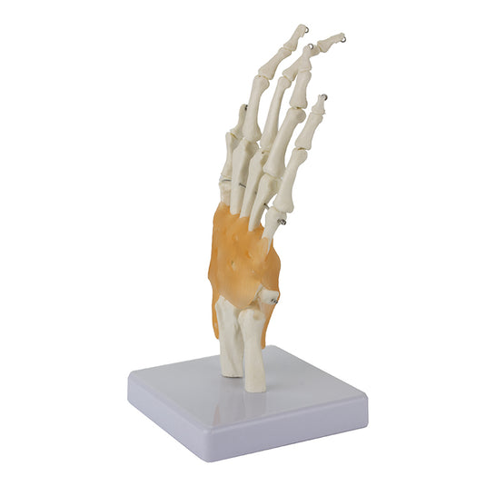 Đây là một mô hình một khối, kích thước thật, thể hiện một cách thực tế cấu trúc chi tiết của bàn tay con người, cho thấy các cấu trúc giải phẫu và các chuyển động sinh lý của khớp tay cùng với các dây chằng của nó. Mô hình khớp nối thể hiện các dây chằng, xương cấu thành khớp cổ tay. Mô hình hiển thị: Xương trụ: phần xa; Xương quay: phần xa; Xương cổ tay: xương thuyền, xương nguyệt, xương chóp và xương thể, xương thang, xương thang nhỏ, xương đầu và xương móc; Xương bàn tay: gồm có 5 xương bàn tay; Dây chằng khớp cổ tay. Các xương ngón tay của bàn tay gồm 14 đốt, 8 xương cổ tay và 5 xương bàn tay. Nghiên cứu các dây chằng của khớp cổ tay bao gồm: dây chằng ra xa xương quay và xương cổ tay. Được làm từ vật liệu tổng hợp bền lâu và lắp ráp bằng tay. Gắn trên một đế polymer bền; Đi kèm với một mô hình giải phẫu 3D tương tác với thực tế tăng cường là công cụ tuyệt vời để khuyến khích việc học và hỗ trợ. Nền tảng này cho phép sinh viên tham gia vào phân tích so sánh các mô hình giải phẫu khi họ so sánh và đối chiếu cấu trúc của các cơ quan riêng lẻ. Sáng kiến này cũng cung cấp một nền tảng cho việc giáo dục liên tục, cung cấp cơ hội cho tất cả sinh viên tăng cường kiến thức về giải phẫu, sinh lý học và bệnh lý sinh lý.
