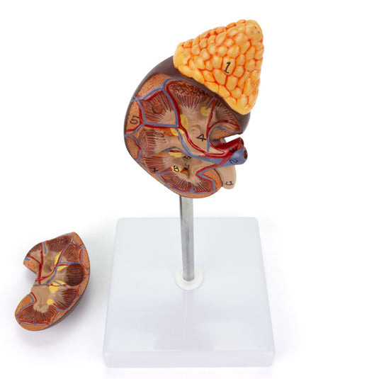 Mô hình thận với tuyến thượng thận, kích thước thật, được cắt theo mặt phẳng phía trước; có thể chia thành 2 phần và cho thấy các cấu trúc bên trong bao gồm vỏ thận, tủy thận, các tháp thận với núm thận, bể thận mở một phần, niệu quản và mạch máu. Các cấu trúc giải phẫu quan trọng được đánh số và chỉ định bằng các màu khác nhau để dễ hiểu. Được làm bằng vật liệu tổng hợp bền bỉ. Kèm theo là mô hình giải phẫu 3D tương tác với thực tế tăng cường, là công cụ tuyệt vời để khuyến khích việc học và hỗ trợ. Nền tảng này cho phép sinh viên tham gia vào phân tích so sánh các mô hình giải phẫu khi họ so sánh và đối chiếu cấu trúc của các cơ quan riêng lẻ. Sáng kiến này cũng cung cấp một nền tảng cho giáo dục liên tục, tạo cơ hội cho tất cả sinh viên nâng cao kiến thức về giải phẫu, sinh lý và bệnh lý sinh lý.
