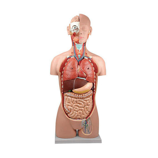 Mô hình kích thước thật gồm 18 phần, cung cấp sự tái hiện chân thực và chi tiết của các cơ quan nội tạng. Đầu được cắt để lộ một nửa não. Cổ được mổ qua bề mặt bụng để hiển thị các cấu trúc cơ, tuyến, mạch máu và thần kinh. Ngực và bụng được mở hoàn toàn để có cái nhìn hoàn hảo, không bị hạn chế về các cơ quan nội tạng và các cấu trúc liên quan. Các cấu trúc giải phẫu của các hệ thống chính của cơ thể được đánh số và xác định trong tờ thông tin đi kèm với sản phẩm; Các thành phần có thể tháo rời bao gồm: Một nửa não, được chia dọc theo trục dọc để lộ các khe, cấu trúc bên trong và mạch máu; Mắt với dây thần kinh thị giác và cơ ngoài nhãn cầu; Khí quản; Động mạch chủ ngực đi xuống và thực quản; Phổi phải và trái (mỗi bên 2 phần), hiển thị cây phế quản và mạch máu; Gan với túi mật; Một nửa quả thận, được cắt dọc theo mặt phẳng trán để hiển thị cấu trúc bên trong và mạch máu; Tim chia làm hai phần hiển thị tâm nhĩ, tâm thất, van tim và cắt ngang thành tim; Dạ dày; Tuyến tụy, dạ dày, tá tràng và lá lách với mạch máu và ống dẫn; Ruột non và ruột già với một cửa sổ có thể tháo rời ở vùng manh tràng; Nắp có thể tháo rời ở vùng háng. Đi kèm là một mô hình giải phẫu 3D tương tác với thực tế tăng cường là một công cụ tuyệt vời để khuyến khích học tập và hỗ trợ. Nền tảng này cho phép sinh viên tham gia phân tích so sánh các mô hình giải phẫu khi họ so sánh và đối chiếu cấu trúc của các cơ quan riêng lẻ. Sáng kiến này cũng cung cấp một nền tảng để tiếp tục giáo dục, tạo cơ hội cho tất cả sinh viên nâng cao kiến thức về giải phẫu, sinh lý học và sinh bệnh học.