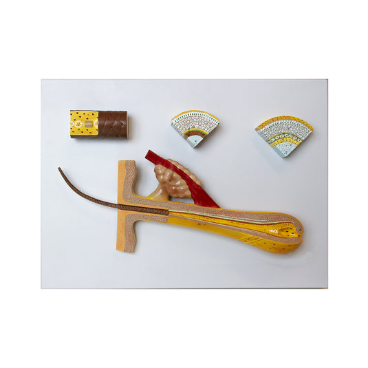 Mô hình tóc phóng đại 100 lần được tạo thành từ bốn mô hình khác nhau trên cùng một nền tảng: mô hình đầu tiên là mặt cắt dọc của củ tóc phóng đại 100 lần kích thước tự nhiên của nó. Ba mô hình còn lại là mặt cắt ngang của thân tóc, củ tóc và bóng tóc được phóng đại. Việc sử dụng màu sắc giúp dễ dàng nhận diện tất cả các lớp khác nhau như lớp vỏ ngoài và lớp trong của củ tóc, lớp cuticle và lớp vỏ. Mô hình được gắn trên nền tảng polymer bền vững. Kèm theo là mô hình giải phẫu 3D tương tác với thực tế mở rộng, là công cụ tuyệt vời để khuyến khích việc học tập và hỗ trợ. Nền tảng này cho phép sinh viên tham gia vào phân tích so sánh các mô hình giải phẫu khi họ so sánh và đối chiếu cấu trúc của từng cơ quan. Sáng kiến này cũng cung cấp một nền tảng cho giáo dục liên tục, tạo cơ hội cho tất cả sinh viên nâng cao kiến thức về giải phẫu, sinh lý và bệnh lý sinh lý.