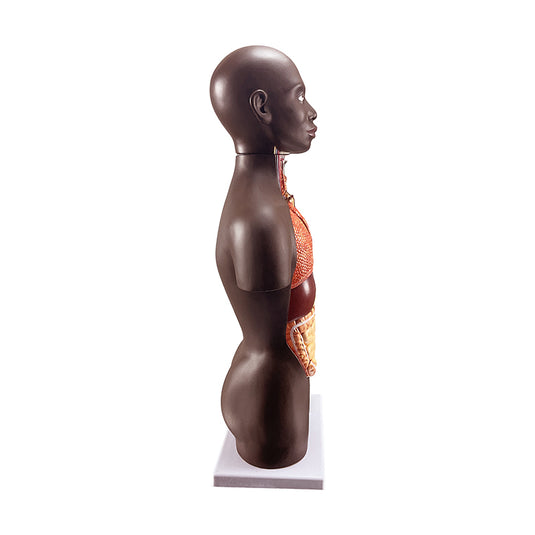 Mô hình torso kiểu mini nửa nam nửa nữ, màu sẫm, kích thước bằng nửa người thật. Đây là công cụ tuyệt vời để dạy về giải phẫu cơ bản. Mô hình gồm 16 bộ phận: đầu, được chia thành 2 phần, cho thấy một phần não và đường hô hấp trên; một nửa của não, cho thấy cấu trúc bên trong; 2 phổi; tim chia thành 2 phần thể hiện buồng tâm nhĩ, tâm thất và van tim; gan kèm túi mật; dạ dày; một mảnh duy nhất bao gồm ruột non, ruột già và tụy; lớp bọc có thể tháo rời để lộ phần bên trong của manh tràng; cơ quan sinh dục nam chia thành 2 phần; cơ quan sinh dục nữ chia thành 2 phần. Kèm theo mô hình giải phẫu 3D tương tác với công nghệ thực tế tăng cường, đây là công cụ tuyệt vời để khuyến khích việc học tập và hỗ trợ. Nền tảng này cho phép sinh viên tham gia vào phân tích so sánh các mô hình giải phẫu khi họ so sánh và đối chiếu cấu trúc của các cơ quan riêng lẻ. Sáng kiến này cũng cung cấp nền tảng cho việc học tập liên tục, mang lại cơ hội cho tất cả sinh viên nâng cao kiến thức của họ về giải phẫu, sinh lý và bệnh lý sinh lý.